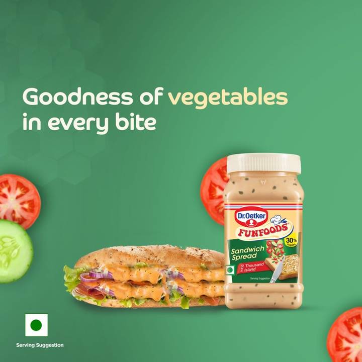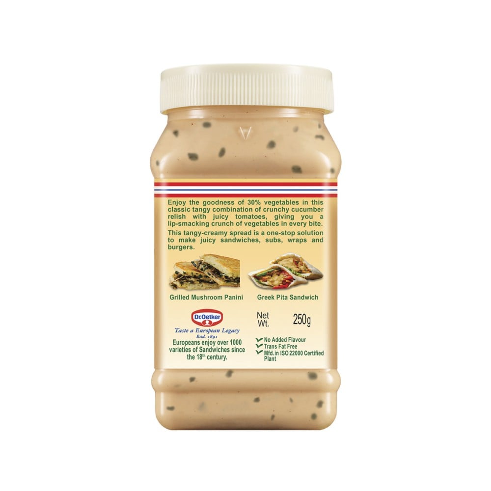 Dr. Oetker FunFoods brings to you this famous dressing as a sandwich spread which lets you enjoy the tanginess of tomatoes in your sandwich. Thousand Island Veg Sandwich Spread not only makes delicious sandwiches but also doubles as a tasty dip for fries and kebabs. Relish the crunch of cucumbers combined with tangy tomatoes, thereby giving you a lip-smacking bite packed with flavourful vegetables. It is 100% vegetarian and trans fat-free.