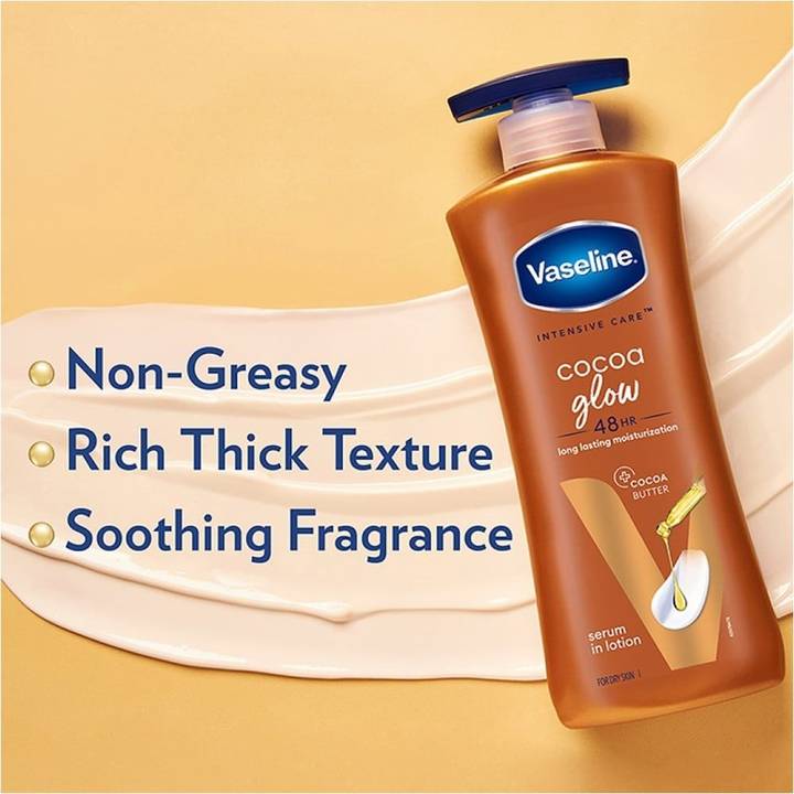 Vaseline Intensive Care Cocoa Glow Body Lotion moisturizes dry skin from the first application Vaseline Cocoa Glow Body Lotion is fast absorbing without feeling greasy